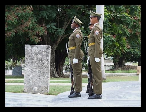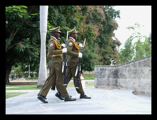 Odbywa się tam co 30 min zmiana warty. Czekamy w gotowości z aparatami. Po chwili w głośnikach rozlega się dźwięk bębnów, a potem marsz. Pojawiają się żołnierze maszerujący defiladowym krokiem w rytm rewolucyjnego marsza. Żołnierze zostali starannie dobrani, żaden nie może mieć więcej niż 175 cm wzrostu, by nie musiał schylać się przy przechodzeniu pod belką u wejścia do grobowca .