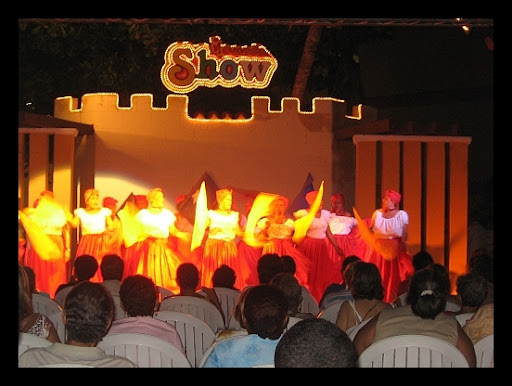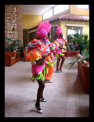 i idziemy na kolacje. Uuuuu... na kolacji tłoczno. Przyzwyczailiśmy się, że zawsze był luz w innych hotelach. A wszystkiemu winni Wenezuelczycy. Kilka ich autokarów z babciami i dziadkami przybyło do naszego hotelu. Na dodatek na kolacji nie było naszych ulubionych ananasów. Na Kubie bardzo nam zasmakowały i objadaliśmy się nimi. Czyli można powiedzieć, że kolacja nie podobała się nam. :))) Potem małą, już naszą polsko-niemiecką grupką poszliśmy na animacje. Niemiecka część grupy planowała jechać taksówką do Trynidadu do jakiegoś lokalu, ale my jakoś nie mieliśmy ochoty więc oni zostali z nami :))) Czyżby im tak zależało na naszym towarzystwie ? Show rozpoczęło „koło gospodyń wiejskich z Wenezueli”. Babcie bardzo nieporadnie przetuptały dwa kawałki, każda w swoim rytmie i kierunku. Ale co się dziwić jak średnia wieku 85 lat (tu będzie prywata – mniej niż Mat
