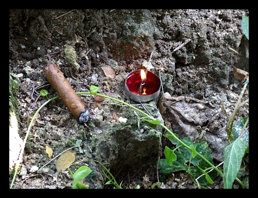 Wracając do samochodu zauważamy na ścieżce zapaloną małą świeczkę i cygaro. Ta świeczka to chyba też od magii.